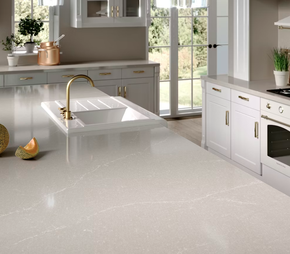 Quartz countertops are engineered stone, as opposed to granite countertops which are made of natural stone. To make quartz countertops, natural quartz crystals are mined from the quarry, and then ground into smaller pieces or even dust. The quartz is then fused with resin binders under intense heat and pressure to form a slab. Pigments are often added to achieve particular colors. The industry standard ratio of quartz to resin is approximately 93% quartz, and 7% resin.